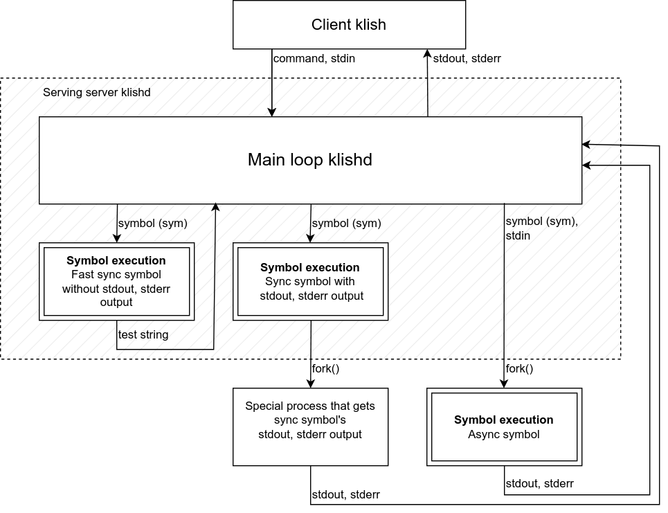 Synchronous symbols (with output to stdout, stderr) cannot receive data through the input stream stdin because they are executed within the handling klishd server, and for the duration of the symbol code execution, other server functions are temporarily halted. Data reception from the client stops. The handling klishd server is a single-threaded program, so synchronous symbols must be used with caution. If a symbol takes too long to execute, the server will hang for that time. Additionally, synchronous symbols are executed in the server's address space. This means that executing an untested symbol containing errors can lead to the handling server crashing. Although a synchronous symbol does not have an input stream stdin, it can use output streams stdout and stderr. To obtain data from these streams and subsequently send them to the client, the handling server spawns a helper process that receives and temporarily stores data coming from the symbol. When the symbol execution completes, the helper process forwards the stored data back to the handling server, which, in turn, sends them to the client. Synchronous symbols are recommended only when the symbol changes the state of the handling server and therefore cannot be executed within another process. For example, navigation through sections (see Scopes) is implemented by a synchronous symbol because the user's position in the section tree is stored in the handling server.